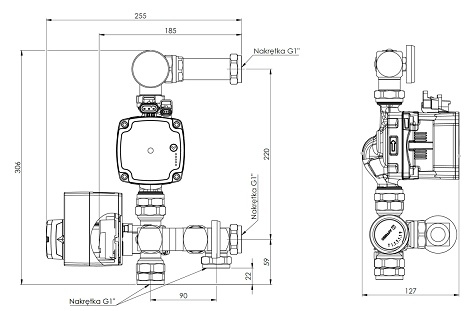 Dwa termometry na zasilaniu i powrocie , dają nam kontrolę nad stopniem zmieszania czynnika.